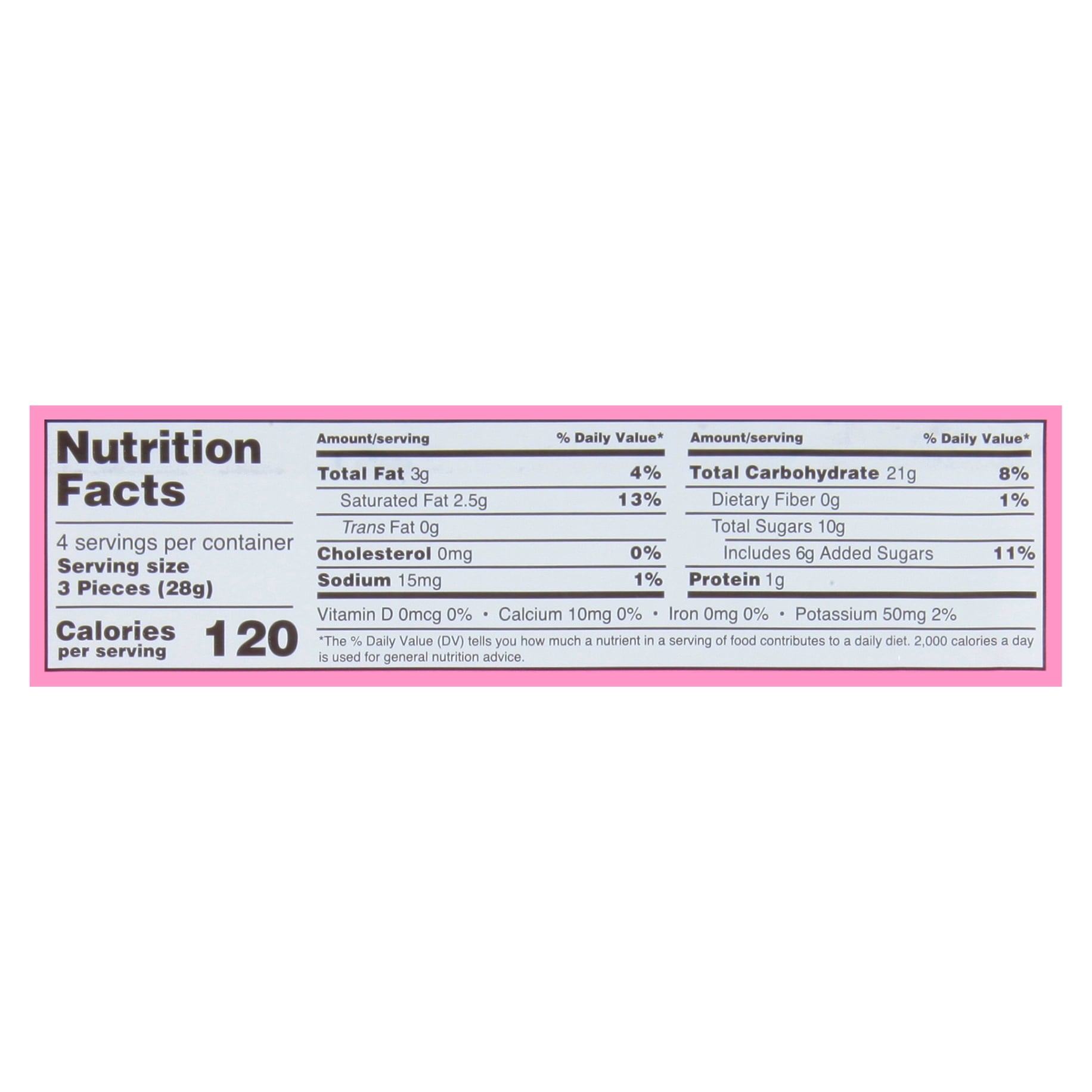- Artificially flavored. 3 Pieces per Serving: 120 calories per serving. Peanut free