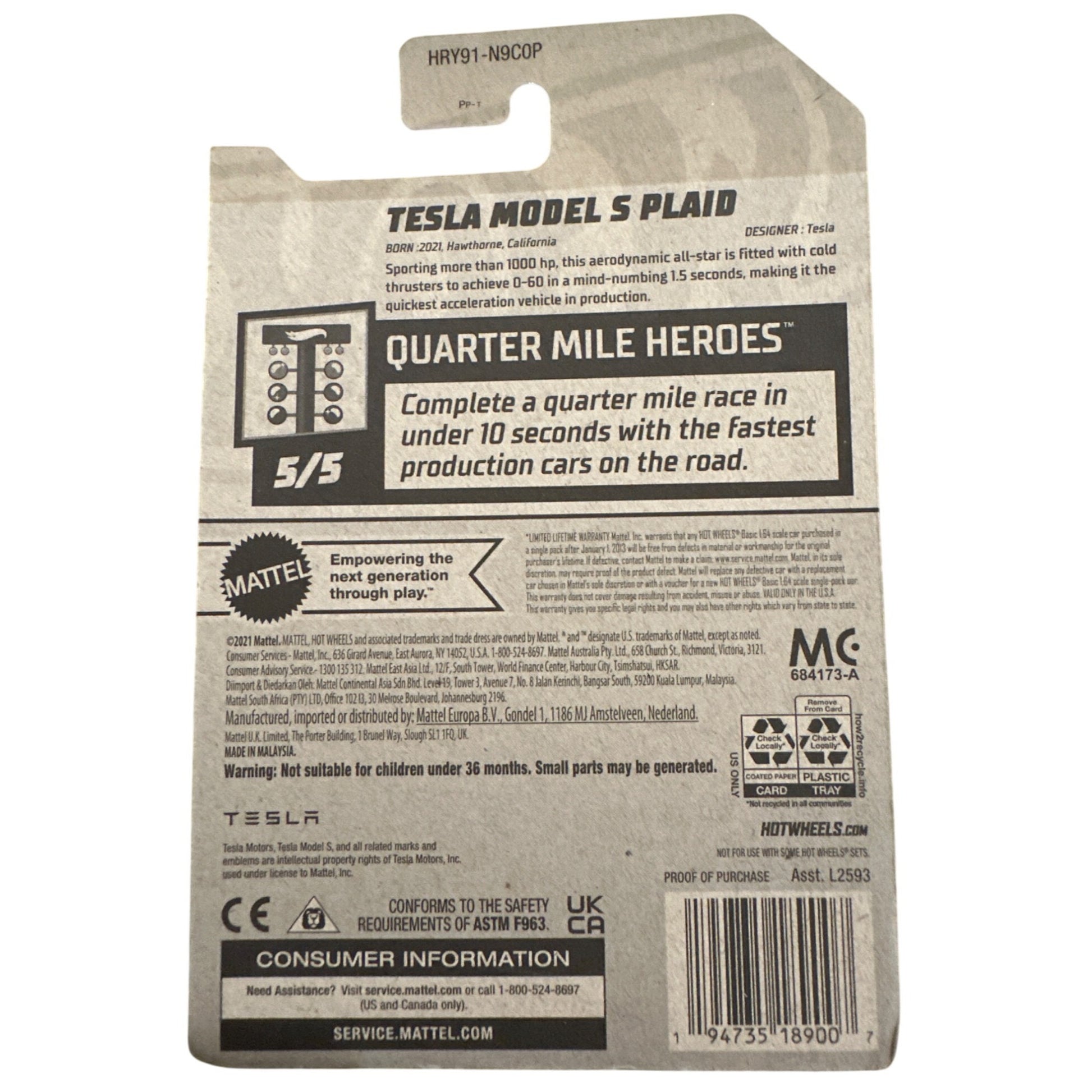238/250 Hot Wheels Die-Cast Car Blue Tesla Model S Plaid 5/5 Quarter Mile Heroes