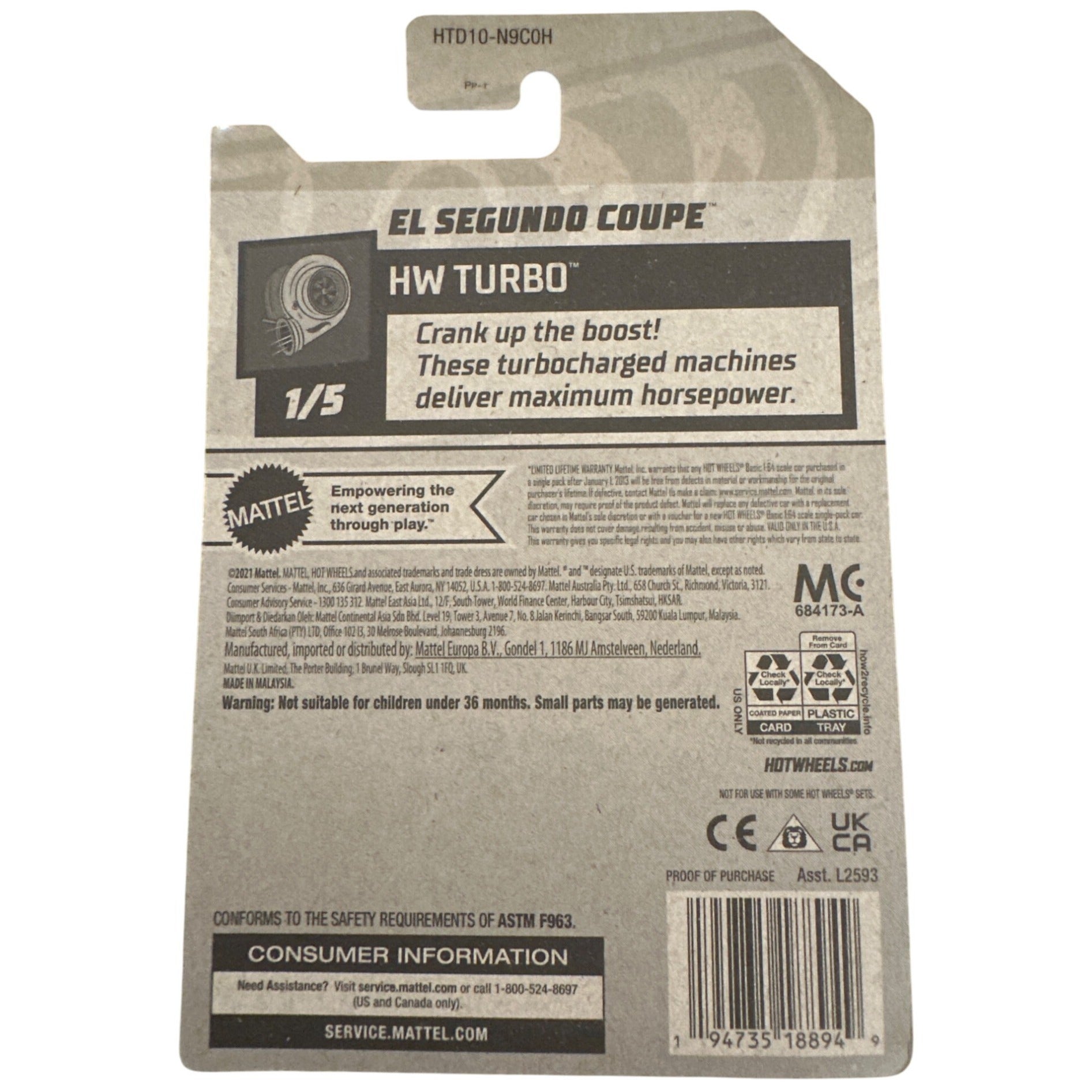 This die-cast collectible car, part of the HW Turbo series, showcases the El Segundo Coupe with its striking blue body, gold wheels, and detailed racing decals. Designed for enthusiasts and collectors, this 1/5 scale car combines sleek design and vivid colors, making it a standout addition to any collection.