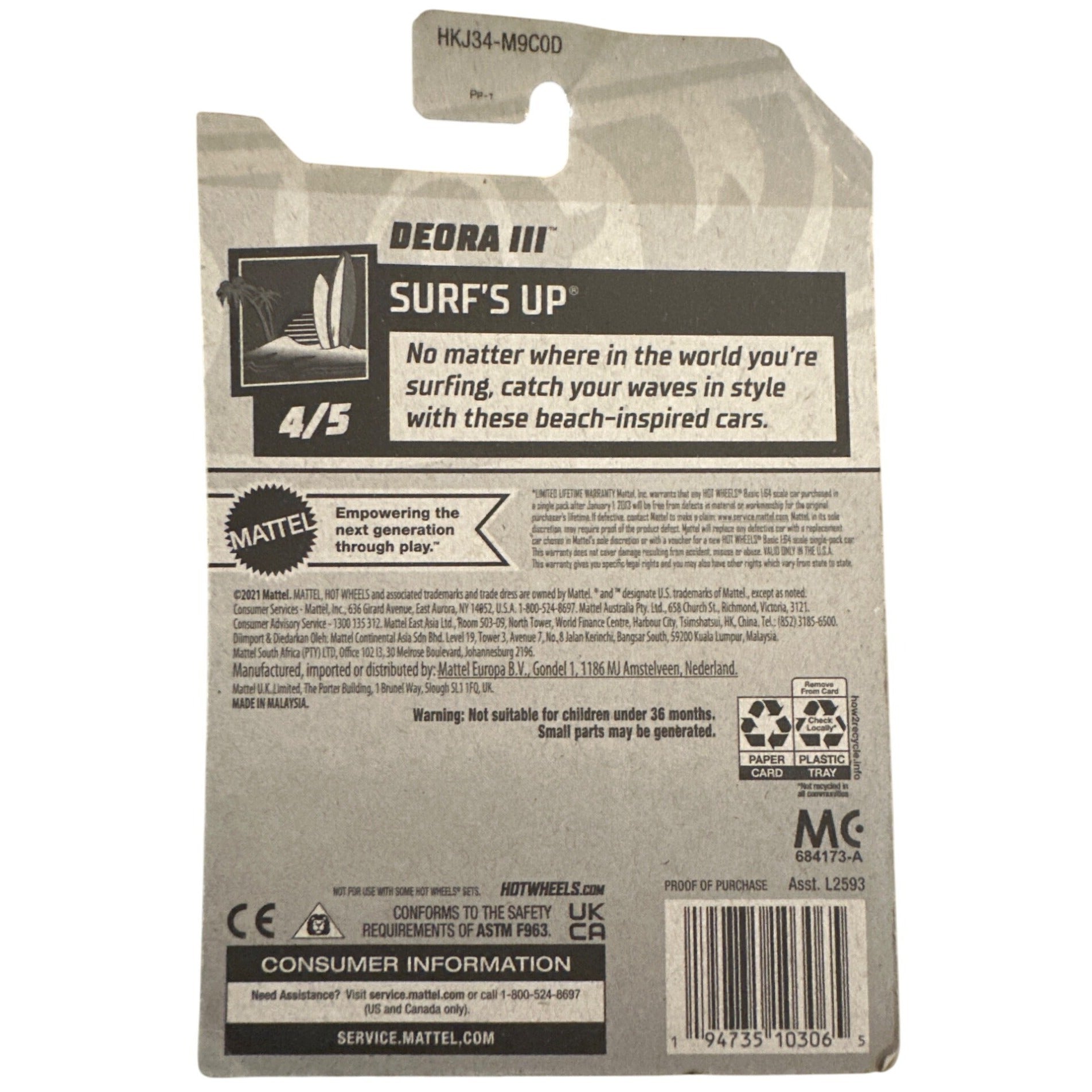 This captivating Hot Wheels Deora III Surf's Up 4/5 die-cast car, part of the 71/250 series, radiates a vibrant blue and yellow color palette. A miniature masterpiece, it invites enthusiasts and collectors to embrace its beach-inspired design. Suited for ages 3 and up, it’s an ideal addition to any collection or an exciting playtime companion.