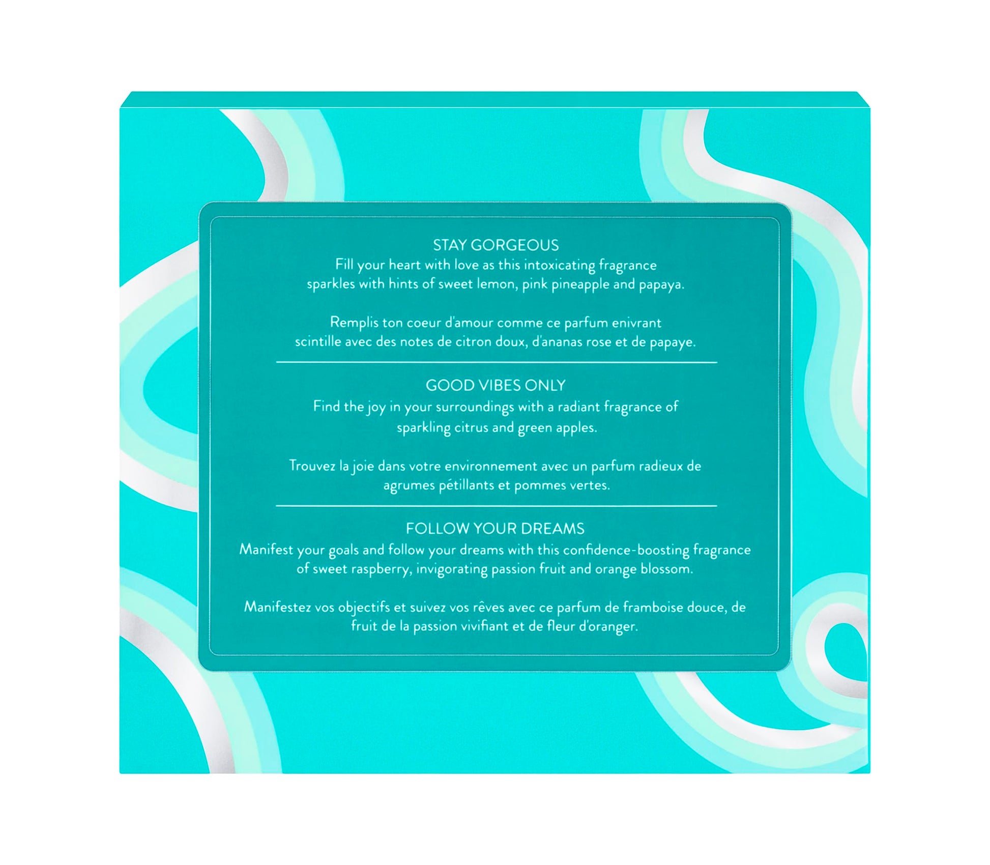 Set of 3 favorite scents in small travel size form. Lovely gift box for gift giving. Scents include stay gorgeous, good vibes and follow your dreams each 1.7 fl oz, limited edition! Travel size. Refillable.