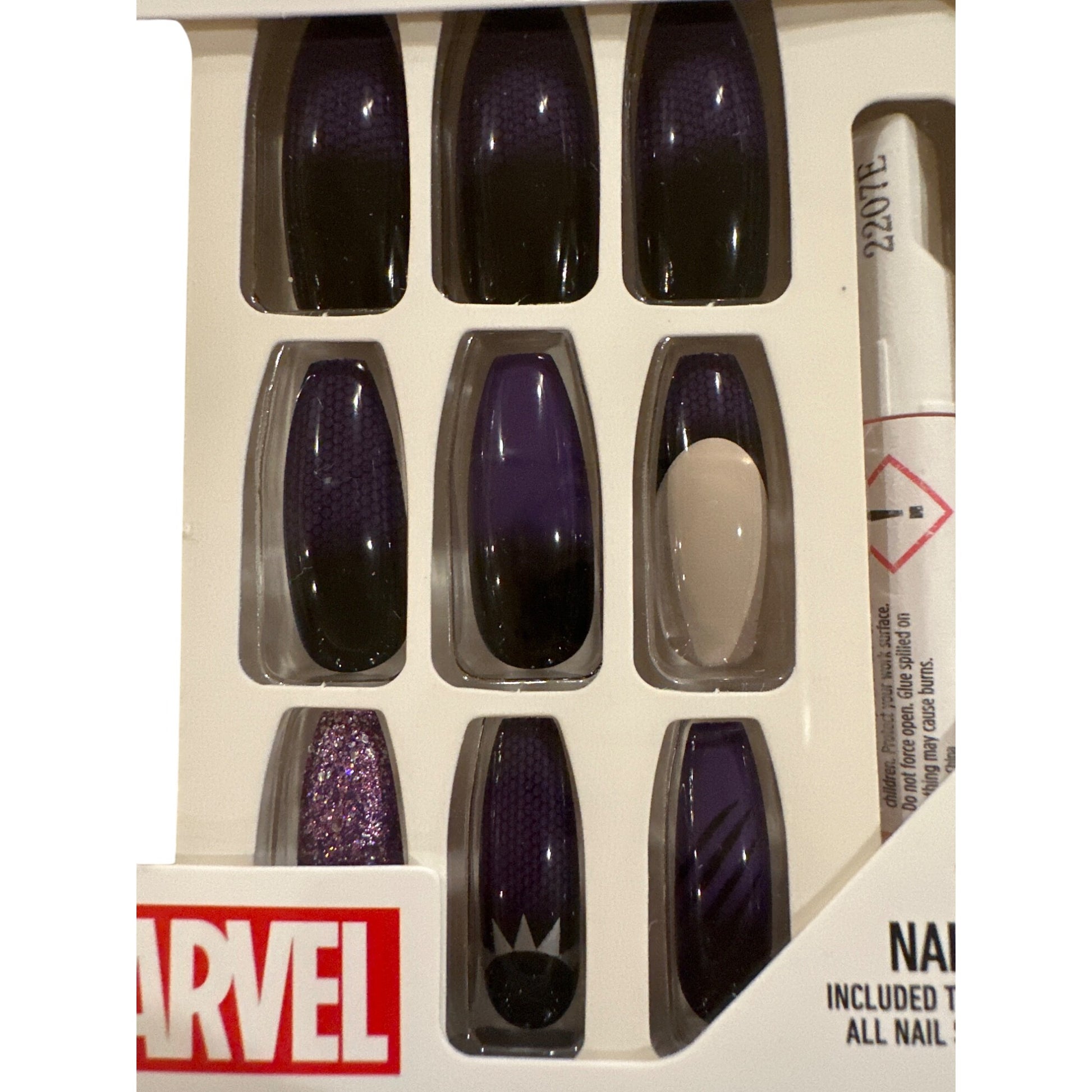 Inspired by the elegance and ferocity of the Black Panther, these extra-long coffin-shaped press-on nails exude chic sophistication. The bold purple and black design, accented with glitter and unique detailing, offers a powerful style statement. Each set is designed for everyday wear, combining durability with a stunning aesthetic worthy of a superhero.