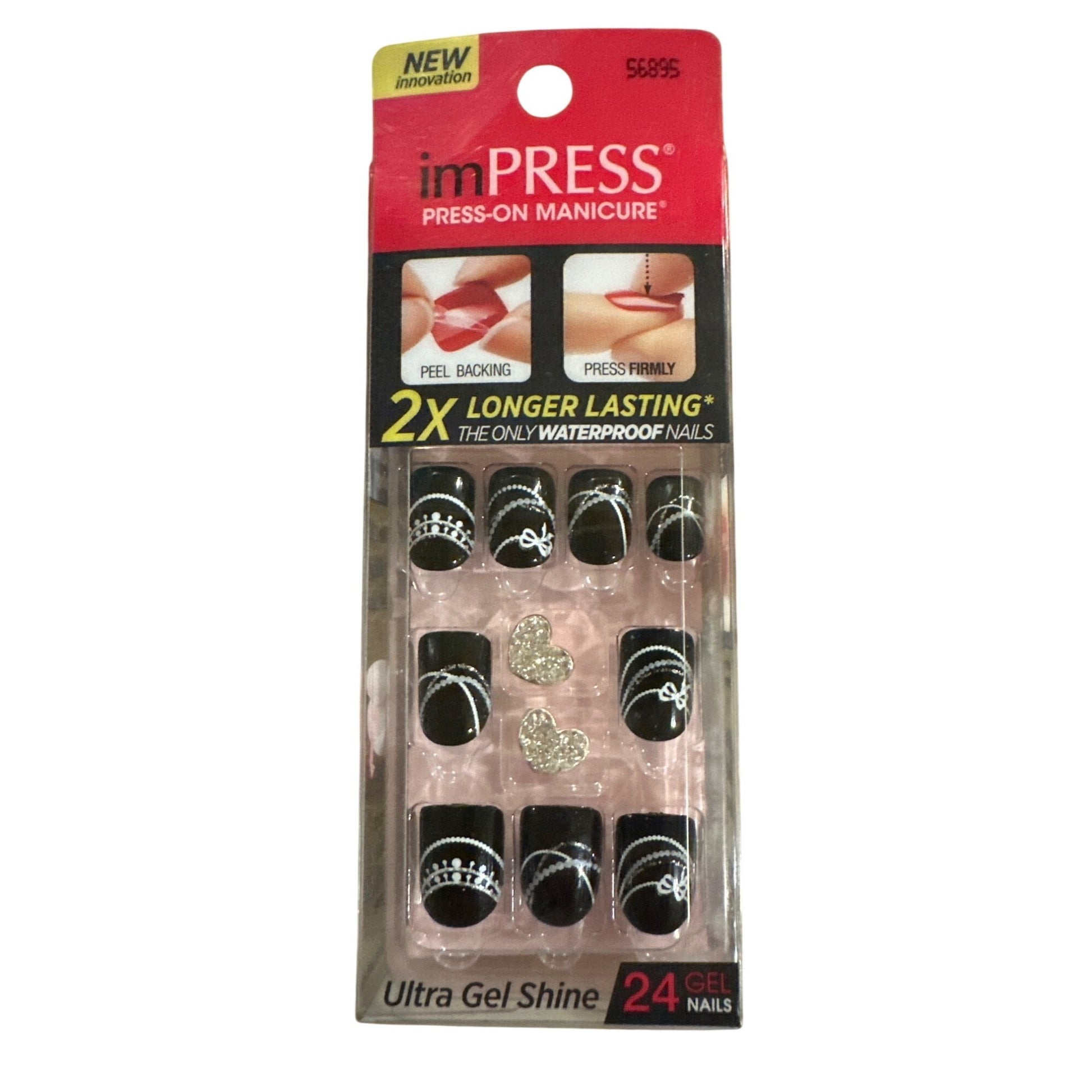 This set of Impress Press-On Manicure nails, titled "Dancing Queen," features a sophisticated black base adorned with intricate white detailing and sparkling heart accents. Designed to last twice as long and offer waterproof wear, these nails deliver salon-quality results without the hassle of glue. A chic, effortless way to elevate your look.