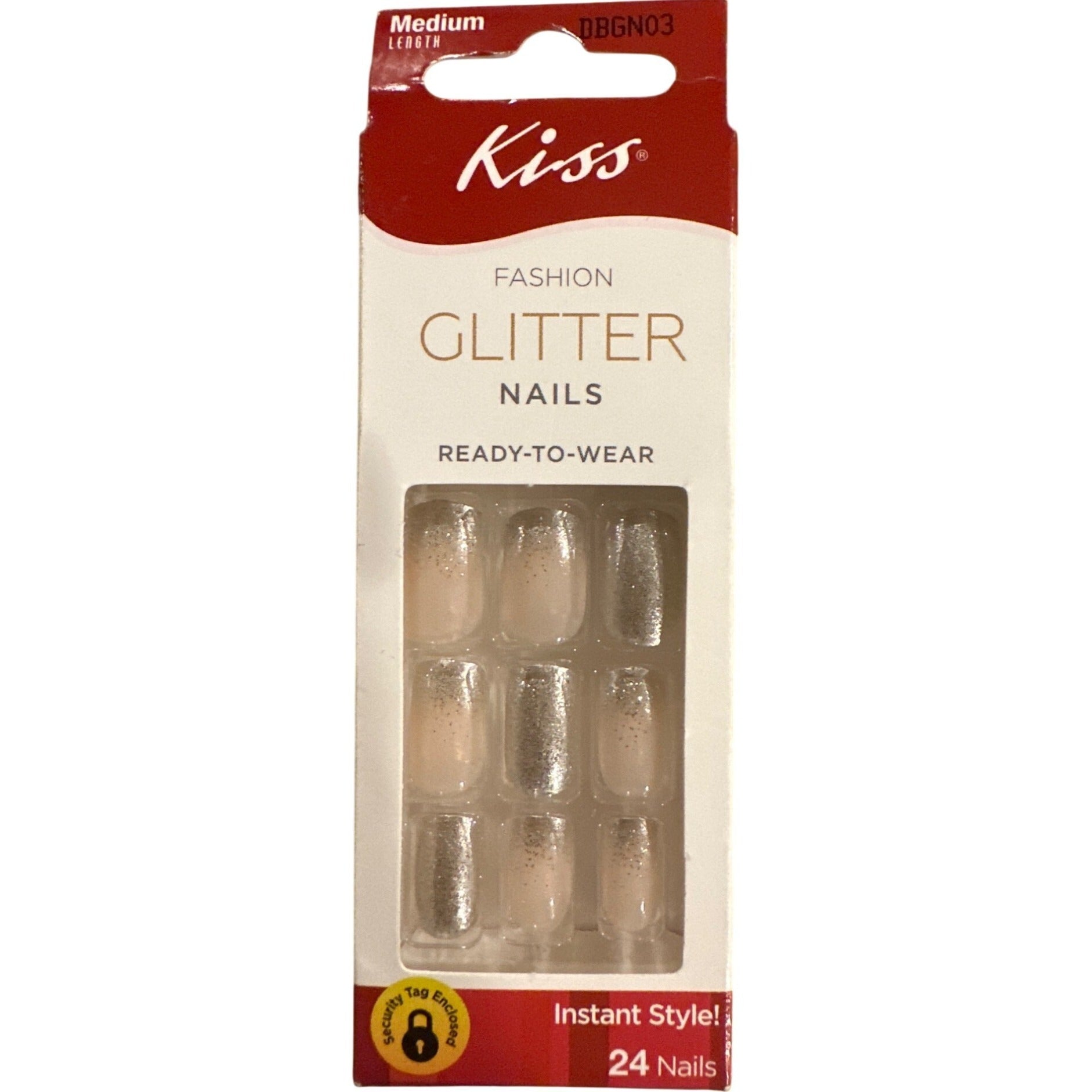 Kiss FASHION GLITTER 24 Nails Medium Squoval Glitter Nude + Silver Ready To Wear