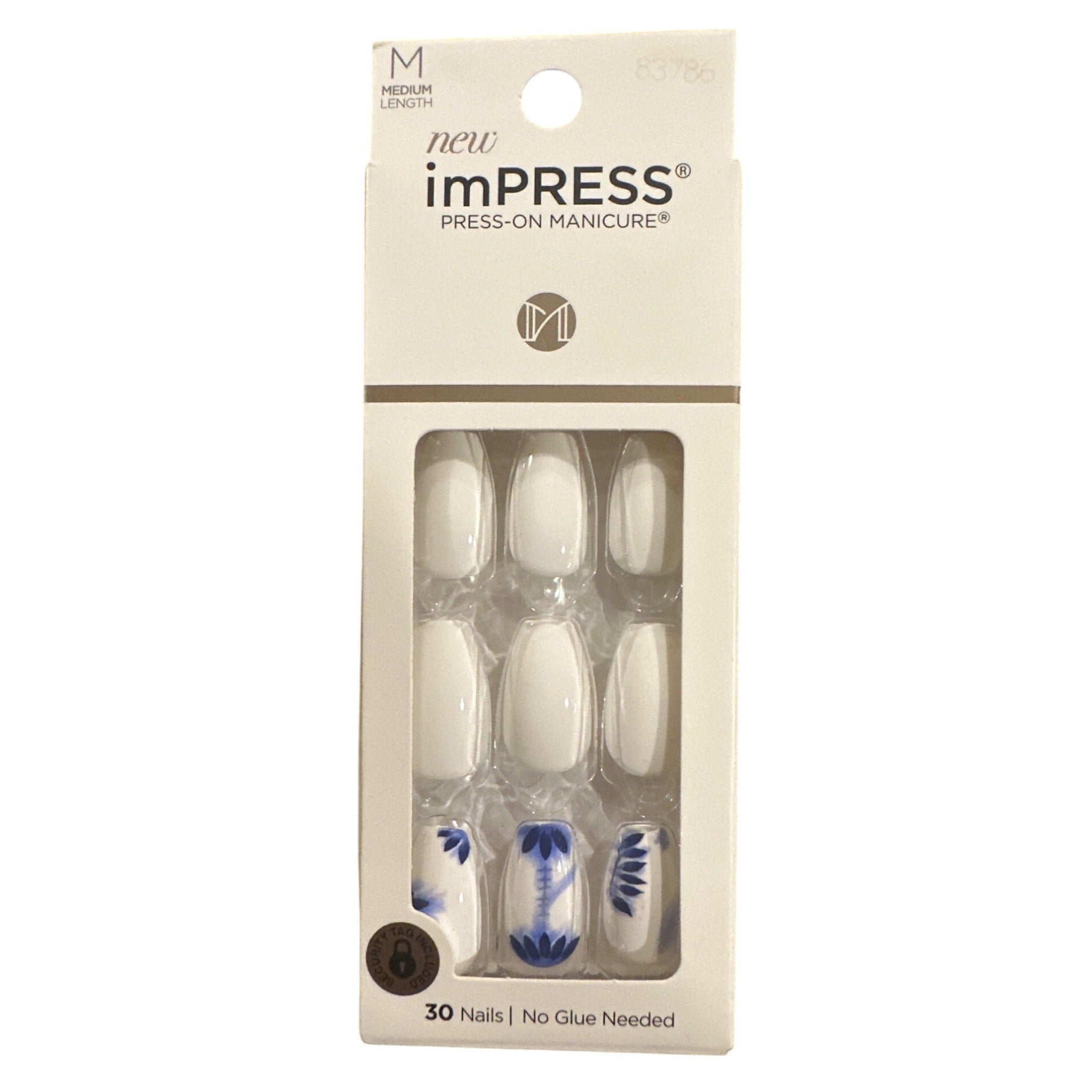 These press-on nails from the Impress collection offer an effortless manicure solution with a medium length and striking white and blue floral design. With no glue needed, they provide a hassle-free application for elegant, polished nails that complement a variety of styles. Their durable finish ensures a lasting wear, making them a convenient and stylish choice.