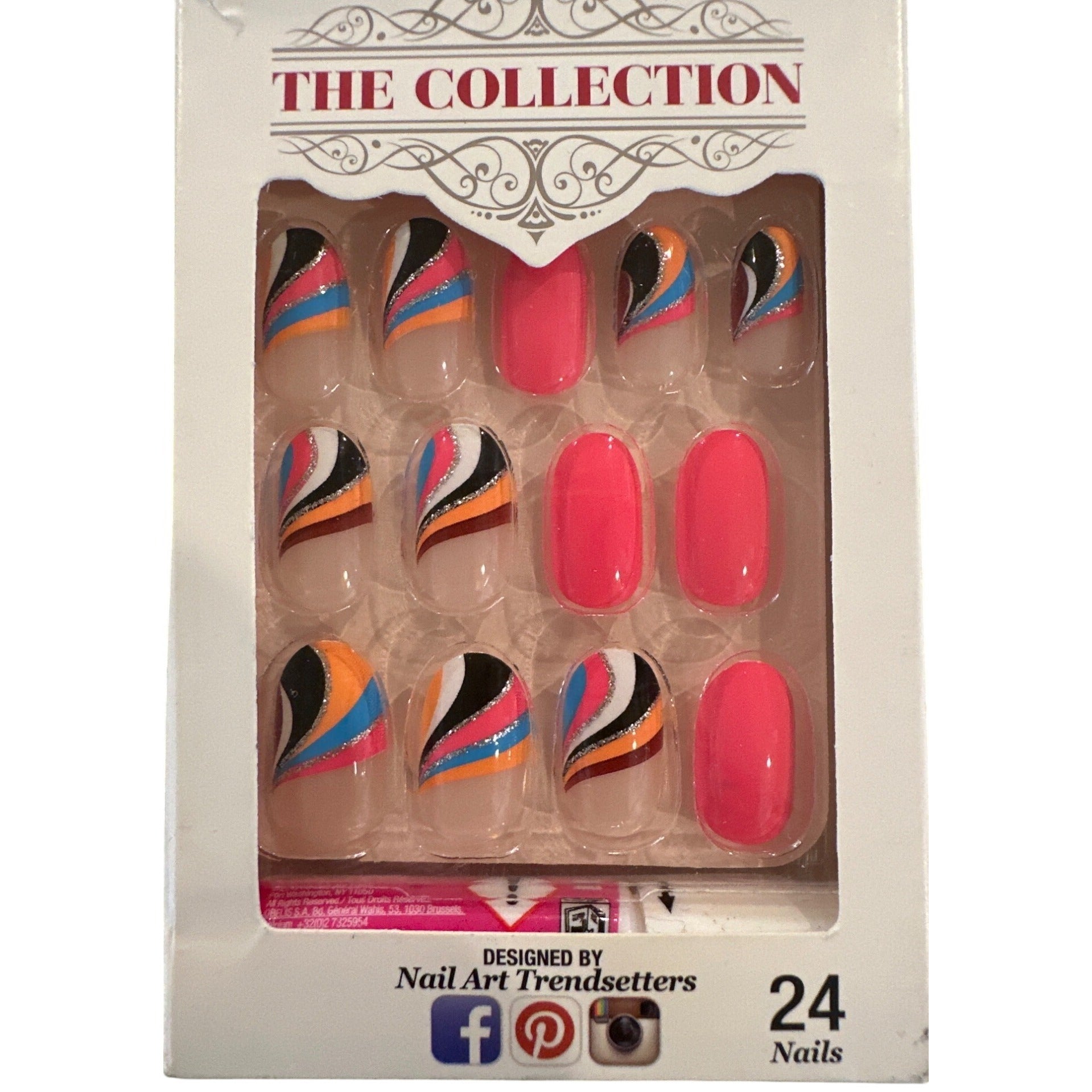 This set of false nails offers a vibrant and chic look, pairing solid pink nails with multicolor swirl designs. Designed for medium length, these nails combine the convenience of at-home application with salon-quality aesthetics. Crafted by Nail Art Trendsetters, they provide an effortless way to enhance your style, ensuring a bold statement.