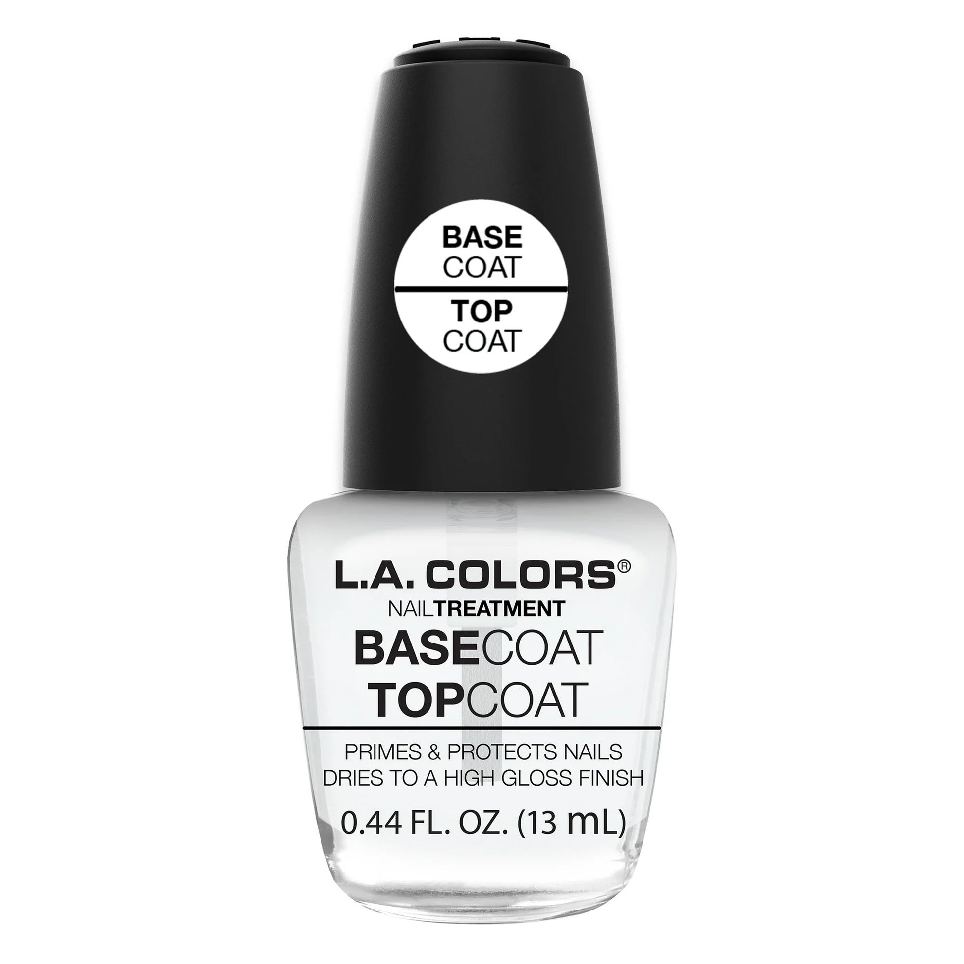 This dual-purpose nail treatment from L.A. Colors provides both a protective base coat and a high-gloss top coat in one bottle. Its clear formula primes the nail surface for an even polish application while sealing in color with a durable, glossy finish. Ideal for maintaining healthy nails and extending polish wear.