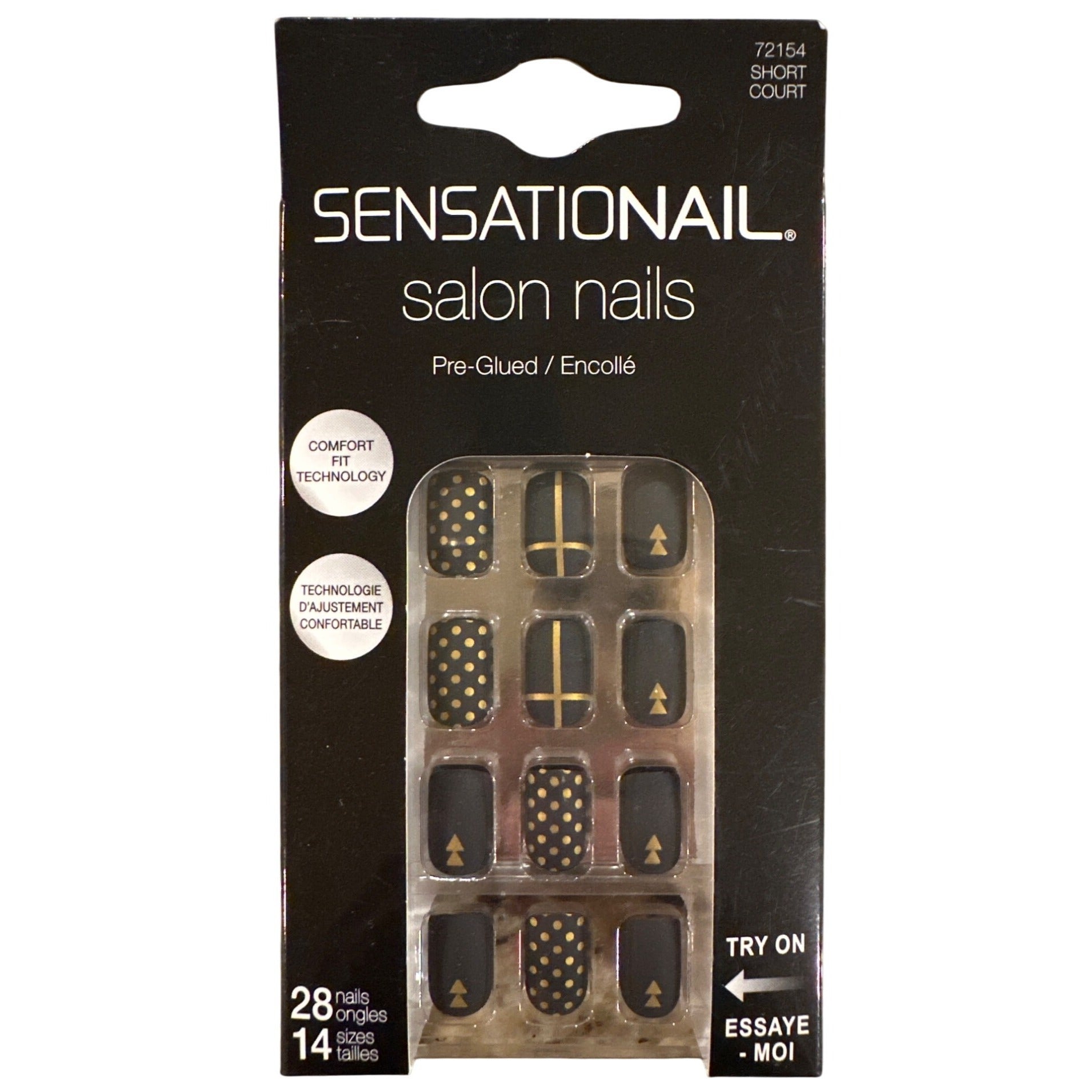 These salon nails from Sensationail are a convenient way to achieve a polished look. Featuring a pre-glued application, they provide a comfortable fit with striking black and gold polka dot and arrow designs. Suitable for short-length wear, they offer a versatile and chic aesthetic that elevates your manicure style effortlessly.