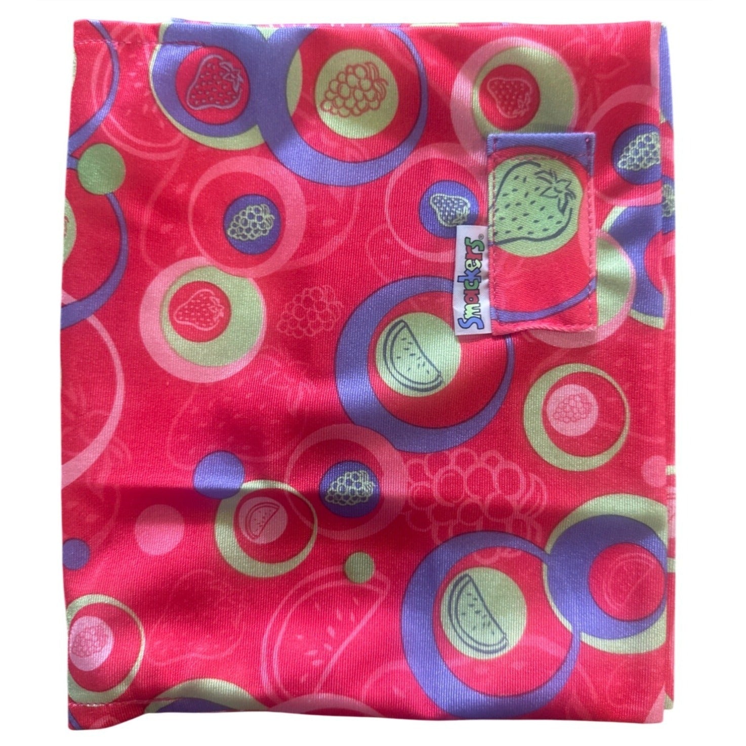 This nostalgic stretch book cover from the Smackers brand showcases a vibrant retro design featuring playful circular patterns in bold red with purple and mint green accents. The pattern incorporates whimsical fruit illustrations including watermelon slices, strawberries, and grapes arranged in overlapping circles. The fabric has a distinctive Y2K aesthetic that perfectly captures the fun, youthful spirit of the Bonne Bell Lip Smacker era.